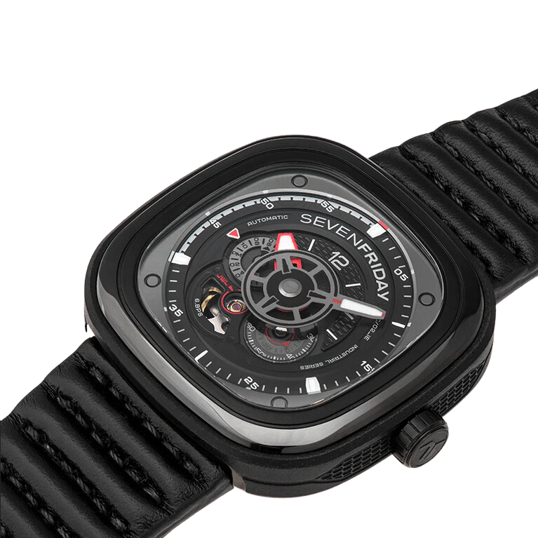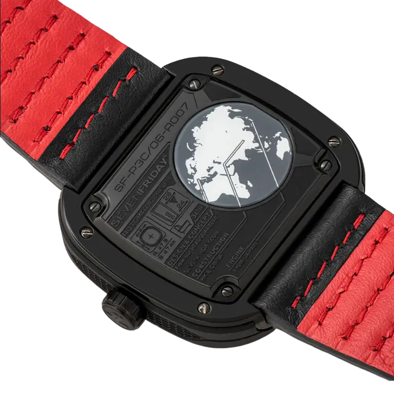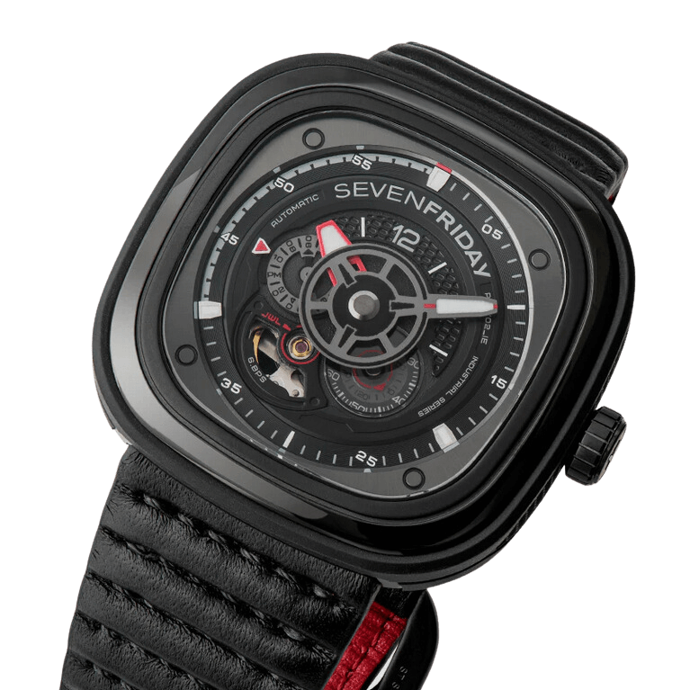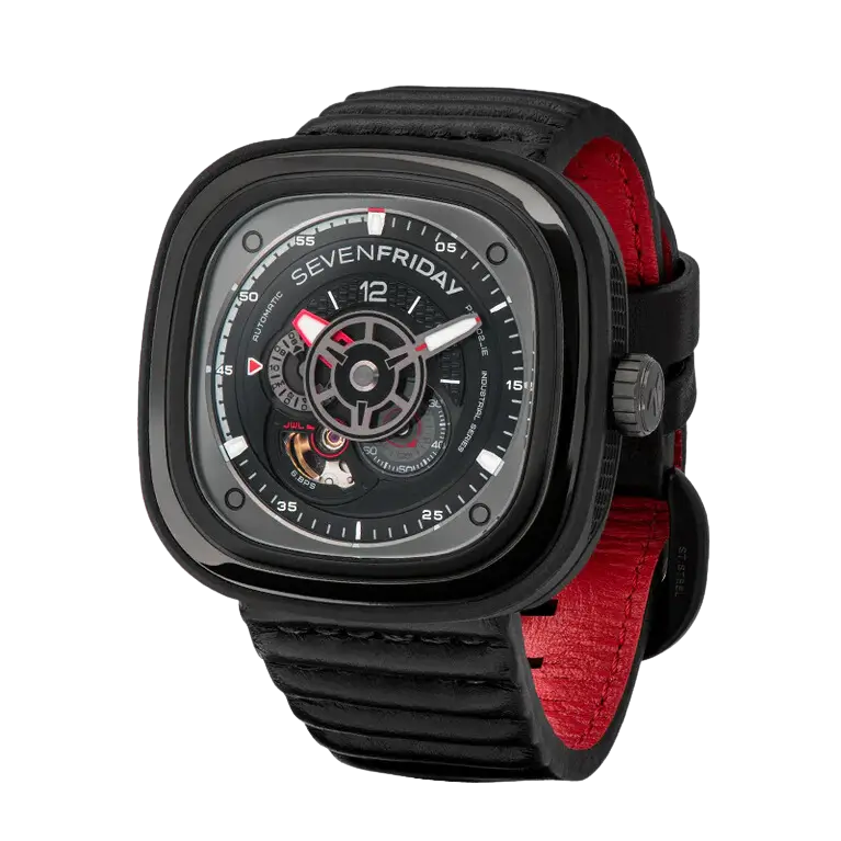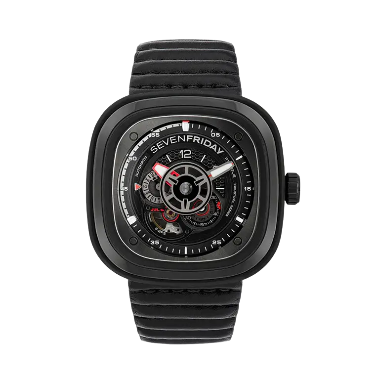 Two wheeled motor sport and High octane have inspires SEVENFRIDAY’S latest release - welcome the P3C/02 “Racer”. The Racer conjures all the high-speed excitement, following in the footsteps of two SEVENFRIDAY giants - the iconic P3 and P3B models. The Racer combines refined masculine good looks and motor sport design codes, featuring black leather strap and rubber animation ring with bursts of red within the stitching and tachometer to show the potential to ignite. With the P3C/02 SEVENFRIDAY introduces its first model to feature 100m water resistance. The Racer is ideal for the active lifestyle and perfect for the open road, where riders can share in the bond between man and machine.