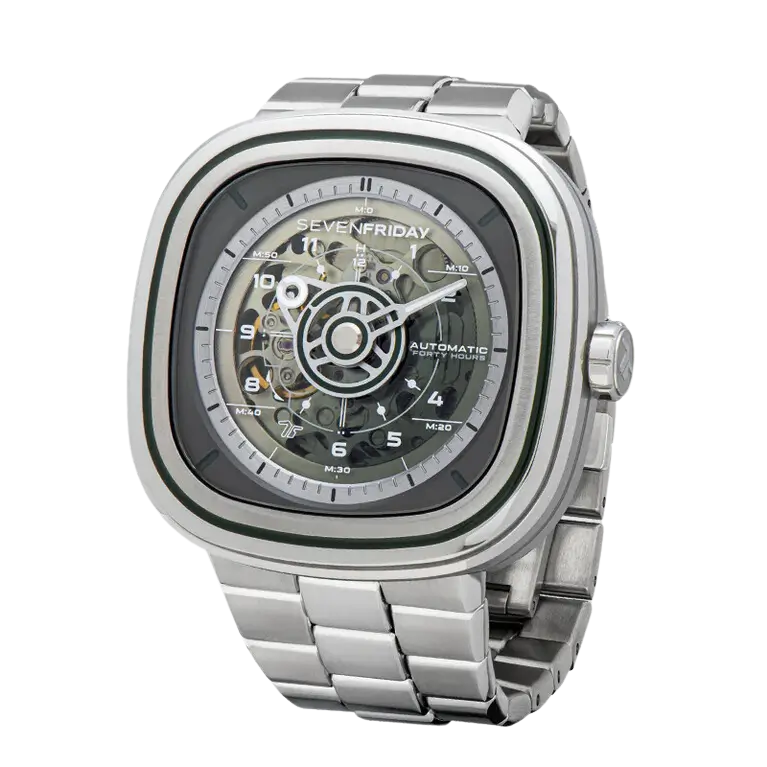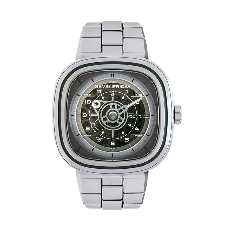 The new watch T1/06M is a evolution of the iconic T1/06 with metal stainless steel bracelet. The new design language plays with transparency, gradients, a skeleton movement and an effective graphic design, resulting in diving into the interface. The T-Series is smaller, thinner and lighter than other SEVENFRIDAY watch series. Graphic design together with skeleton movement are inspired by the blueprints from the industrial technical department, therefore the use of the letter “T”.